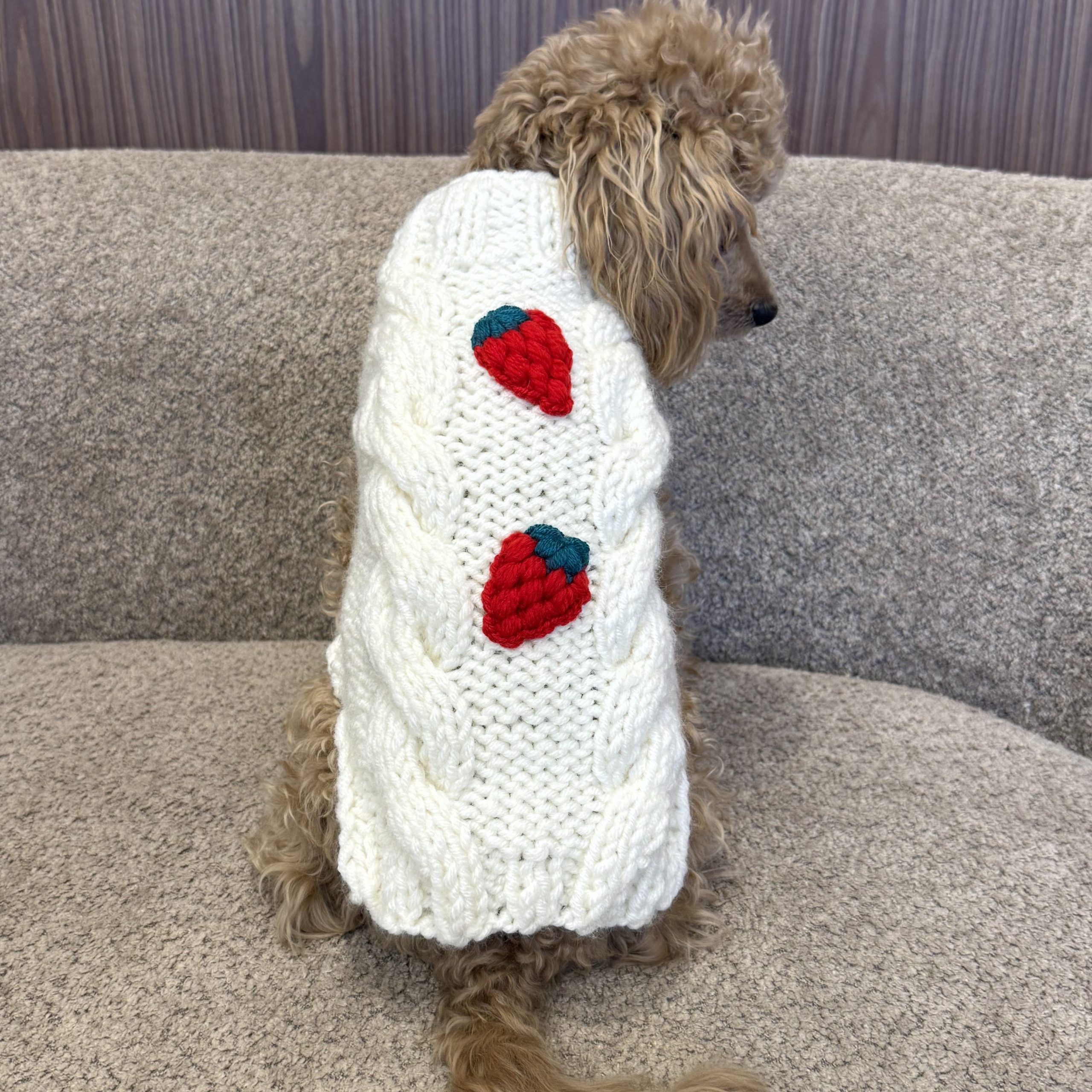 Sweterek może zostać wykonany na wymiar, dzięki czemu idealnie dopasuje się do sylwetki Twojego pupila. Możesz również wybrać ulubiony kolor włóczki, grubość splotu warkoczowego czy ozdobne dodatki, aby nadać mu indywidualny charakter.